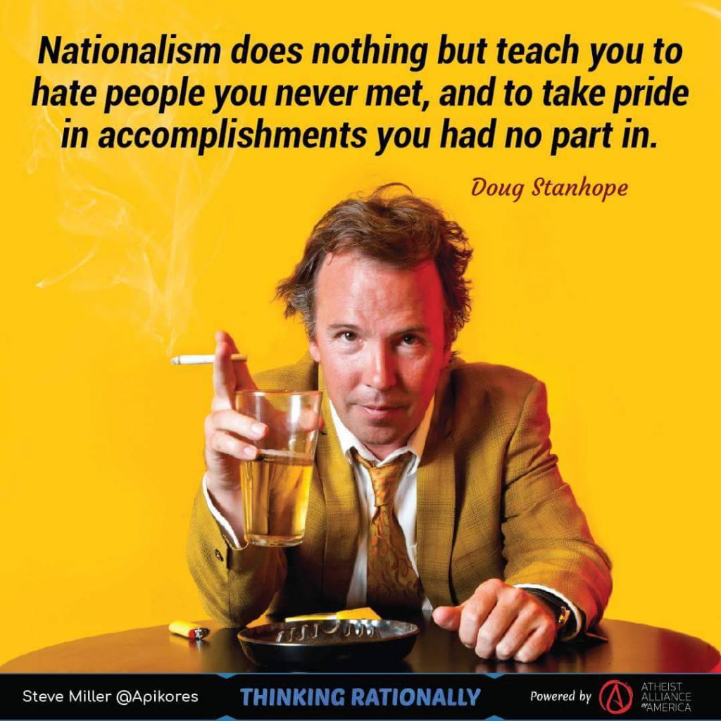 Los nacionalismos no hacen otra cosa que enseñarte a odiar a gente que no conoces y a estar orgulloso de logros en los que no has participado. Doug Stanhope. Monologuista estadounidense